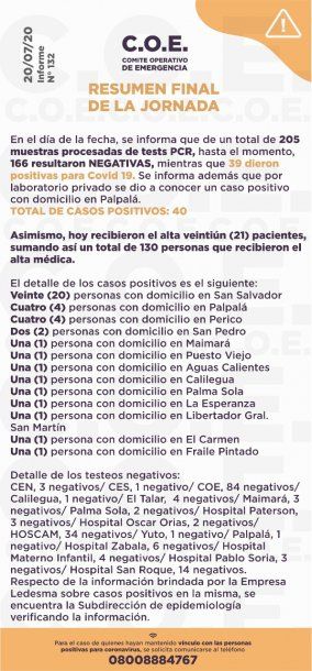 El informe del COE a la noche del 21 de julio