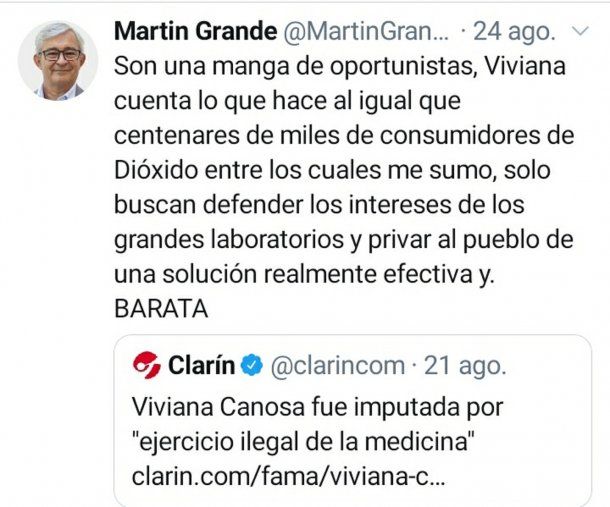 Esta no es la primera vez que un dirigente perteneciente el frente de Juntos por el Cambio defiende el uso del dióxido de cloro, el diputado por la provincia de Salta, Martín Grande, había defendido a través de su cuenta de Twitter a la periodista Viviana Canosa cuando tomó dicha sustancia: “Son una manga de oportunistas, Viviana cuenta lo que hace al igual que centenares de miles de consumidores de Dióxido (de cloro) entre los cuales me sumo, solo buscan defender los intereses de los grandes laboratorios y privar al pueblo de una solución realmente efectiva y BARATA” .