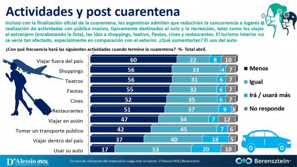 Con la finalización de la cuarentena, los argentinos admiten que reducirían la concurrencia a lugares o realización de actividades con público masivo, típicamente destinados al ocio y la recreación, tales como los viajes al extranjero, las idas a shoppings, teatros, fiestas, cines y restaurantes. El turismo interior no se vería tan afectado, especialmente en comparación con el exterior. ¿Qué aumentarían en lo que sería la nueva normalidad? El uso del auto para evitar el transporte público.