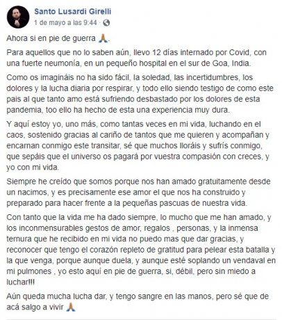 El músico argentino Santiago Lusardi murió ayer de coronavirus tras estar internado por neumonía desde mediados de abril en un hospital del sur de Goa, India. Su último y conmovedor mensaje en las redes sociales hablaba sobre sus ganas de vivir y su lucha contra el virus, que terminó con su vida a los 41 años.