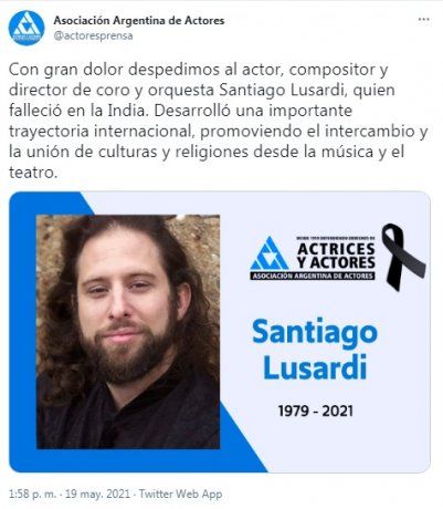 Desde la Asociación Argentina de Actores enviaron un mensaje en despedida del músico: “Con gran dolor despedimos al actor, compositor y director de coro y orquesta Santiago Lusardi, quien falleció en la India. Desarrolló una importante trayectoria internacional, promoviendo el intercambio y la unión de culturas y religiones desde la música y el teatro”.