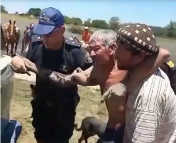 Efectivos de la Policía de Corrientes rescataron a un anciano que cayó a un pozo con barro cuando quiso cruzar el cauce de una laguna que por efectos de la sequia se encuentra sin agua.