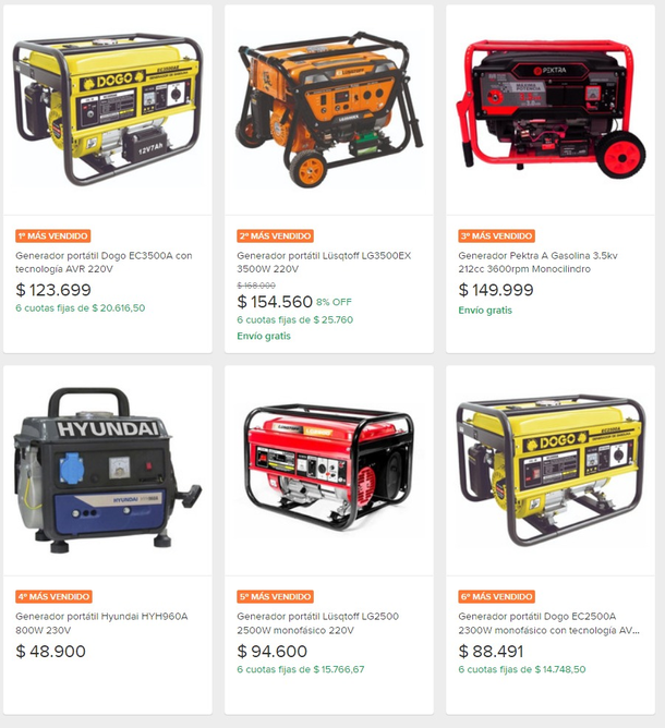 En el sitio de comercio electrónico más popular de la Argentina, el más vendido cuesta $123.699 y se puede pagar en seis cuotas fijas. Le sigue uno de 3500W por 154.560 también ofrecido en seis cuotas.