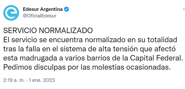 Aproximadamente a las 2 de la mañana de este domingo, Edesur informó a través de sus redes sociales que el problema estaba normalizado.