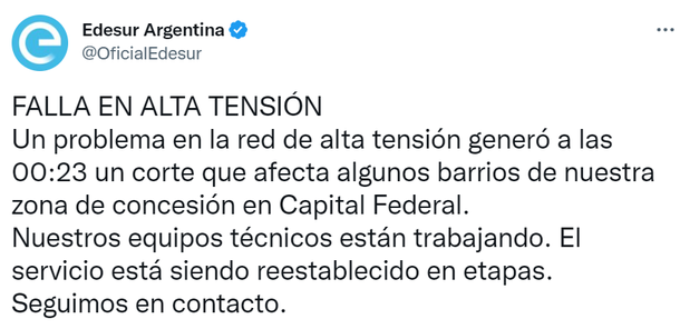 "Un problema en la red de alta tensión generó a las 00:23 un corte que afecta algunos barrios de nuestra zona de concesión en Capital Federal", reportó la empresa a través de sus redes sociales.