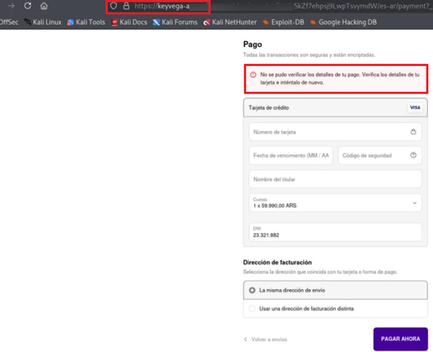 Cuando la víctima intenta pagar su compra, el sistema la redirige a otro sitio específico con otro dominio que pide completar todos los datos de la tarjeta. El supuesto pago nunca se procesa, pero la información financiera queda en manos de los delincuentes cibernéticos.