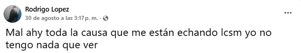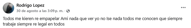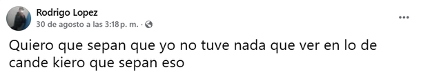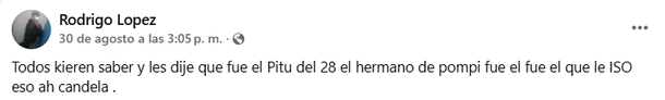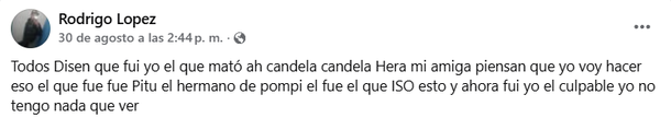 El sábado por la tarde, en sus redes sociales, López escribió varios mensajes en los cuales aseguraba una y otra vez que él no era el asesino de Candela e incluso señaló a otra persona: “Todos dicen que fui yo el que mató a Candela. Candela era mi amiga. ¿Piensan que voy a hacer eso? El que fue, fue Pitu, el hermano de Pompi. Él fue el que hizo esto y ahora soy yo el culpable, yo no tengo nada que ver”, escribió Rodrigo.