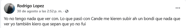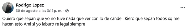 E insistió: “Yo no tengo nada que ver con lo que pasó con Cande. Me quieren subir a un bondi (a un asunto) que nada que ver. Yo también quiero que sepan que yo no fui”.