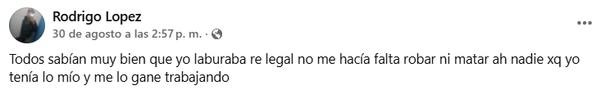 En un desesperado intento por dar a conocer su versión, Rodrigo escribió: “Todos mis vecinos saben que yo trabajaba todos los días, me iba a las 6 de la madrugada y volvía a las ocho de la noche. ¿Con qué necesidad voy a hacer eso que me acusan?".