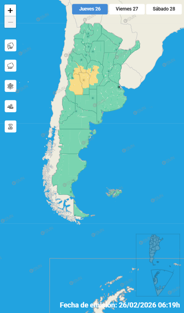 Esto propiciará el desarrollo de fenómenos locales de peligro. Entre hoy y mañana, hay seis provincias que mantienen al menos una parte de su territorio bajo alerta oficial. Para la tarde y noche de este jueves, el aviso rige para la mayor parte del área llana de Mendoza, el este de San Juan, sur de La Rioja, centro y norte de San Luis, y la zona serrana de Córdoba.