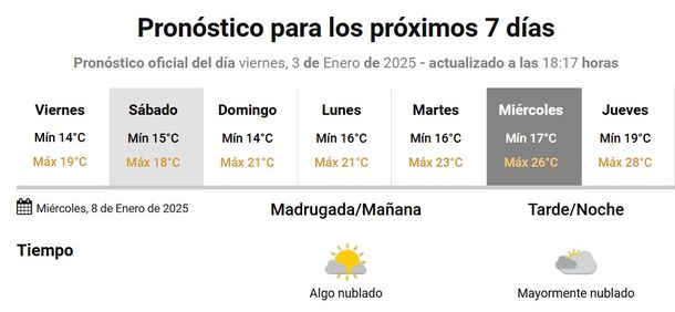 Algo similar ocurrirá el lunes, pero el martes la máxima irá en ascenso, para que el miércoles 8 de enero sea definitivamente un día de playa y calor. Con cielo algo nublado, la mitad de la semana que viene promete dejar a los turistas ponerse la malla: la mínima rondará los 17 grados, mientras que la máxima subirá a 26.
