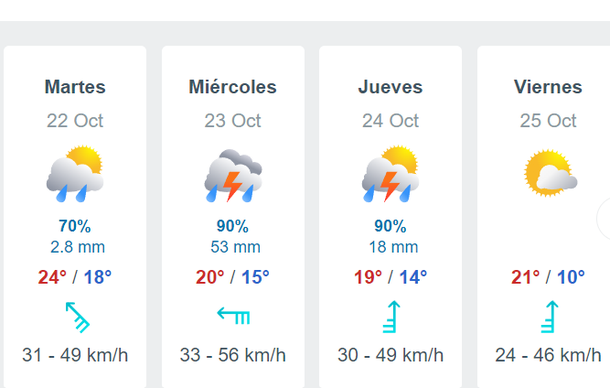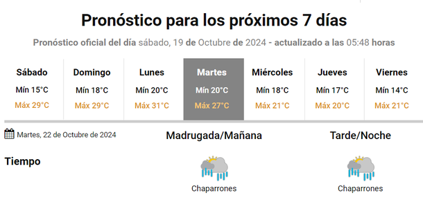 El Servicio Meteorológico Nacional y pronosticadores privados anuncian lluvias al menos durante las jornadas del miércoles y jueves, 23 y 24 de octubre.