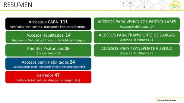 Los otros 47 puntos de acceso a la Ciudad continuarán cerrados, con vallas y presencia de seguridad para ser abiertos sólo en casos de emergencia.