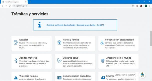 Como primer paso tenés que ingresar a la página web argentina.gob.ar. Al descender, bajo el título TRÁMITES Y SERVICIOS, encontraremos un recuadro que invita a solicitar el nuevo certificado de circulación y descargar la app Cuidar – Covid-19.
