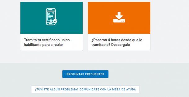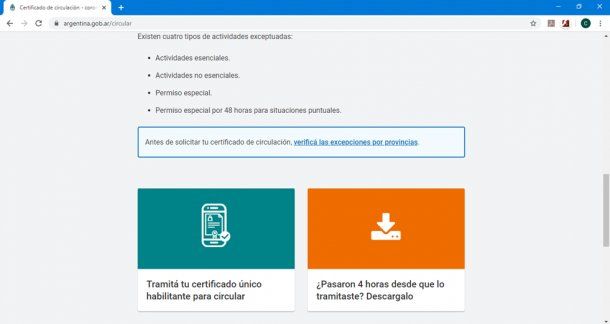 Al hacer clic sobre ese link, la página nos dirige hacia la sección “Certificado de circulación - coronavirus COVID-19”. Al final de la página, encontraremos dos recuadros, uno para tramitar el certificado habilitante para circular durante la cuarentena, y el otro para descargarlo una vez que hayan pasado al menos 4 horas desde la finalización del trámite. Para iniciar la gestión del permiso debemos hacer clic sobre el primer recuadro.