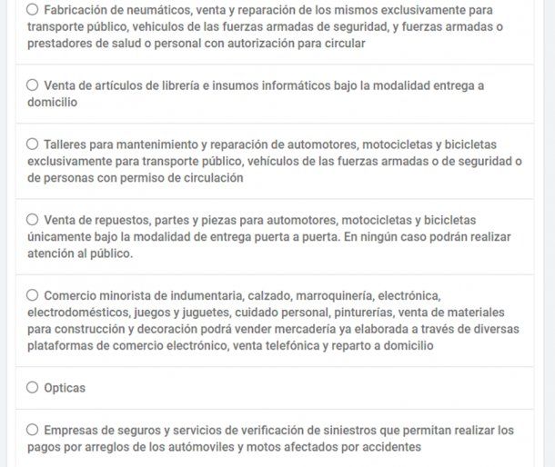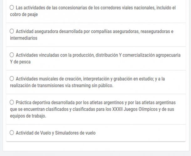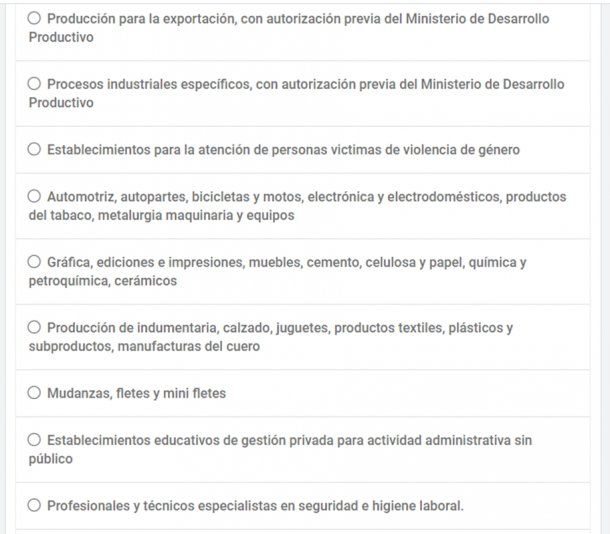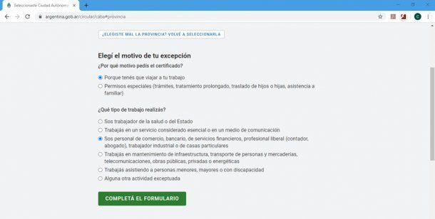 Al elegir la primera opción, se abrirá un cuestionario para que indiquemos cuál es la actividad que desarrollamos. Una vez que seleccionamos la opción correspondiente, debemos hacer clic sobre el recuadro verde que indica “COMPLETÁ EL FORMULARIO”.