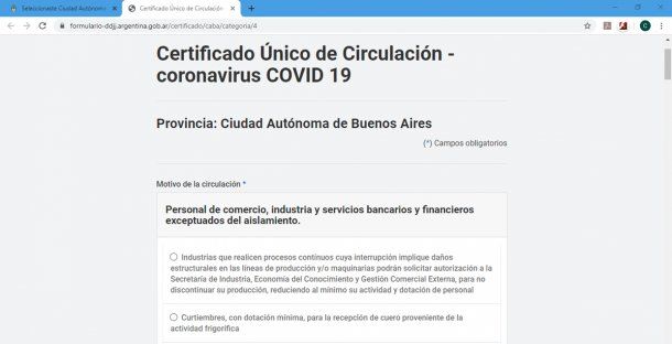 En la sección siguiente debemos completar los datos requeridos para finalizar la solicitud. Primero elegiremos una de las 32 excepciones al aislamiento.