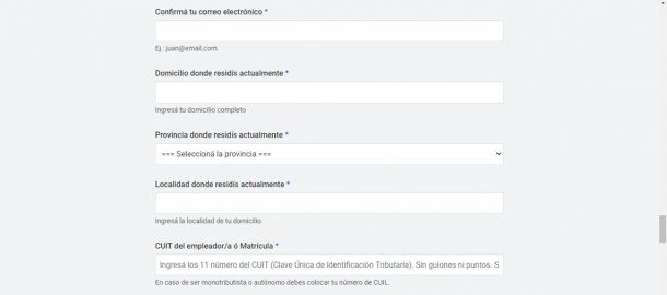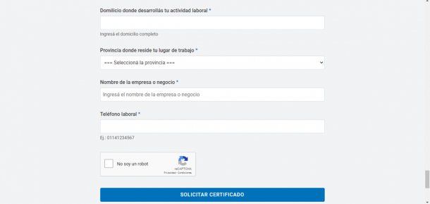 Después debemos ingresar nuestros datos personales: Nombre, DNI, Número de trámite del DNI, Género, CUIL, Número telefónico (incluyendo el código de área), Correo electrónico, Domicilio, Provincia y Localidad en las que residís actualmente, CUIT/ Matrícula del Empleador, Actividad desarrollada, Medio de transporte utilizado (Transporte público, Vehículo y/o Moto, Bicicleta, Pie), Patente del Vehículo utilizado en caso de corresponder, Número de tarjeta SUBE o tarjeta de transporte local, Fecha de inicio de actividades, Domicilio donde desarrollás tu actividad laboral, Provincia donde reside tu lugar de trabajo, Nombre de la empresa o negocio, Teléfono laboral.