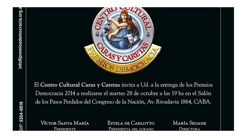 La Ceremonia contará con la presencia de la presidenta honoraria de los Premios, la titular de Abuelas de Plaza de Mayo, Estela de Carlotto, el impulsor del premio Víctor Santa María, y un jurado integrado por personalidades de destacada trayectoria en la defensa y promoción de la democracia, premiados en la edición de los Premios Democracia 2013.