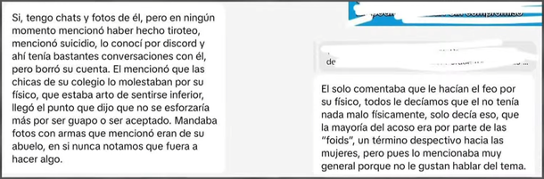“El mencionó que las chicas de su colegio lo molestaban por su físico, que estaba harto de sentirse inferior, llegó el punto que dijo que no se esforzaría más por ser guapo o ser aceptado. Mandaba fotos con armas que mencionó eran de su abuelo, en si nunca notamos que fuera a hacer algo”, relató la persona que interactuó con él.