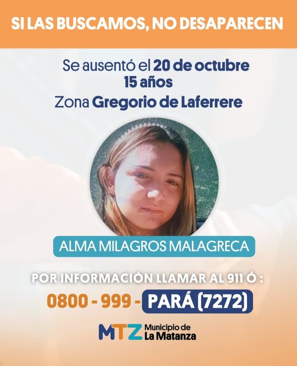 Alma Milagros Malagreca, de 15 años, está desaparecida desde el lunes 20 de octubre cuando salió del colegio al mediodía y no regresó a su casa, en la localidad bonaerense de Gregorio de Laferrere, partido de La Matanza. Su familia sospecha que se fugó con un hombre de 23, que dice ser policía. Convocaron a una nueva movilización para pedir por su aparición.