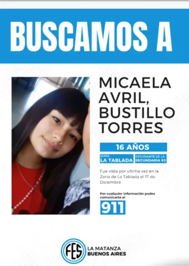La localidad bonaerense de La Tablada se encuentra conmocionada ante la desaparición de Micaela Avril Bustillos Torres, una adolescente de 16 años que fue vista por última vez el pasado miércoles 17 de diciembre. Desde ese entonces, no se sabe sobre su paradero.