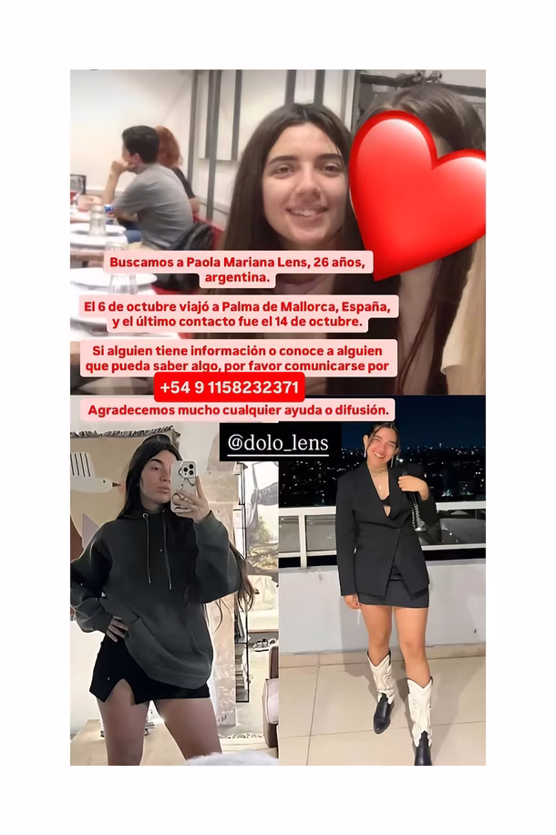 La desaparición de Paola Mariana Lens, una joven argentina de 26 años, mantiene en vilo a su familia y a las autoridades. La joven había viajado a España a comienzos de octubre para trabajar como niñera en Palma de Mallorca, pero desapareció a los ocho días de llegar.