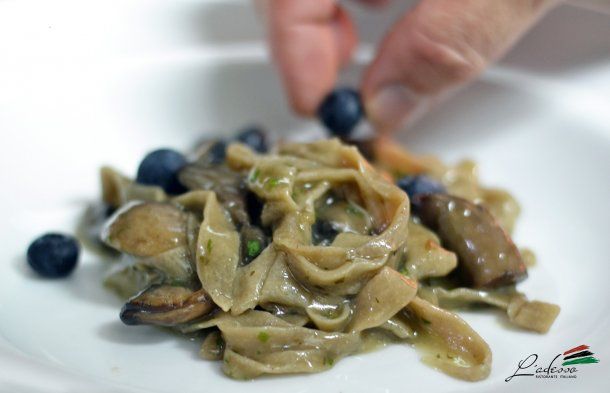 Il piatto (a elección)Pappardelle con ragu’ de tres carnes y hongosScialatielli con langostinos, tomates cherry y rúcula