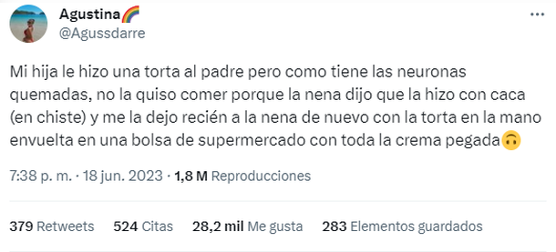 "Mi hija le hizo una torta al padre pero como tiene las neuronas quemadas, no la quiso comer porque la nena dijo que la hizo con caca (en chiste). Y me la dejó recién a la nena de nuevo, con la torta en la mano envuelta en una bolsa de supermercado con toda la crema pegada", contó @agussdarre.