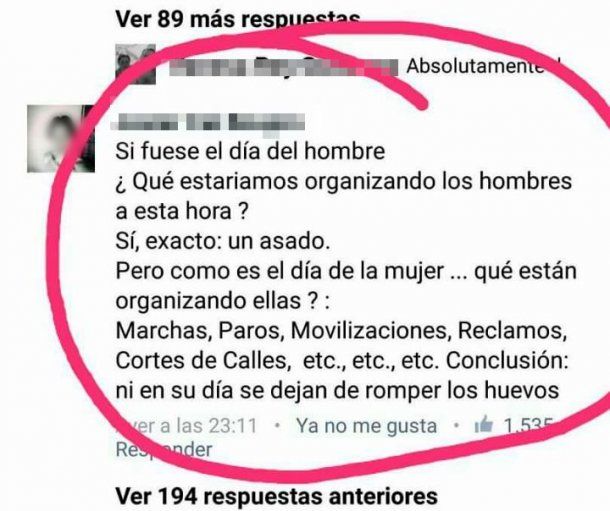 “Si fuese el día del hombre, qué estaríamos organizando los hombres a esta hora. Sí, exacto: un asado. Pero como es el día de la mujer… qué están organizando ellas? Marchas, paros, movilizaciones, reclamos, cortes de calles, etc., etc., etc. Conclusión: ni en su día se dejan de romper los huevos”, dice el comentario.