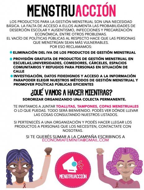 El colectivo “Economía Feminista” propone que los artículos sanitarios para el ciclo menstrual sean entregados a las mujeres en forma gratuita. La iniciativa llegó hasta la Legislatura porteña y no prosperó.