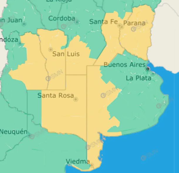 El Servicio Meteorológico Nacional (SMN) emitió este sábado una alerta amarilla en Buenos Aires y otras siete provincias argentinas. De acuerdo con el mapa, las lluvias y tormentas afectarán principalmente a la zona central del país.
