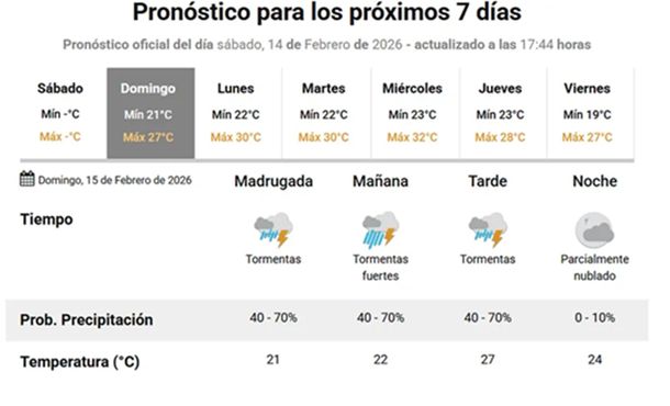 Para lo que queda del fin de semana de Carnaval, el lunes continuará nublado, pero no se pronostican precipitaciones, con una máxima de 30° y una mínima de 20°.