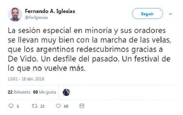 Los seguidores lo compararon con el diputado Alfredo Olmedo, quien dijo estar de acuerdo con el proyecto pero pidió suspender la reunión porque ya se había cumplido el tiempo reglamentario, se levantó y se fue.