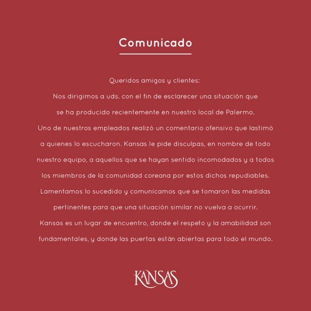 El restaurante emitió un comunicado intentando aclarar el episodio. Aseguran que se tomaron "las medidas pertinentes" contra el empleado que insultó a una mujer coreana.