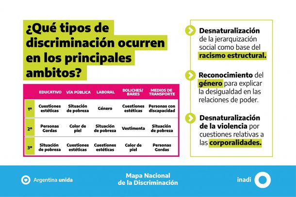 Los ámbitos en los que más se discrimina a las personas por cuestiones estéticas, según el Mapa de discriminación del INADI, son en el ámbito educativo y en ámbitos de esparcimiento nocturno como boliches o bares.