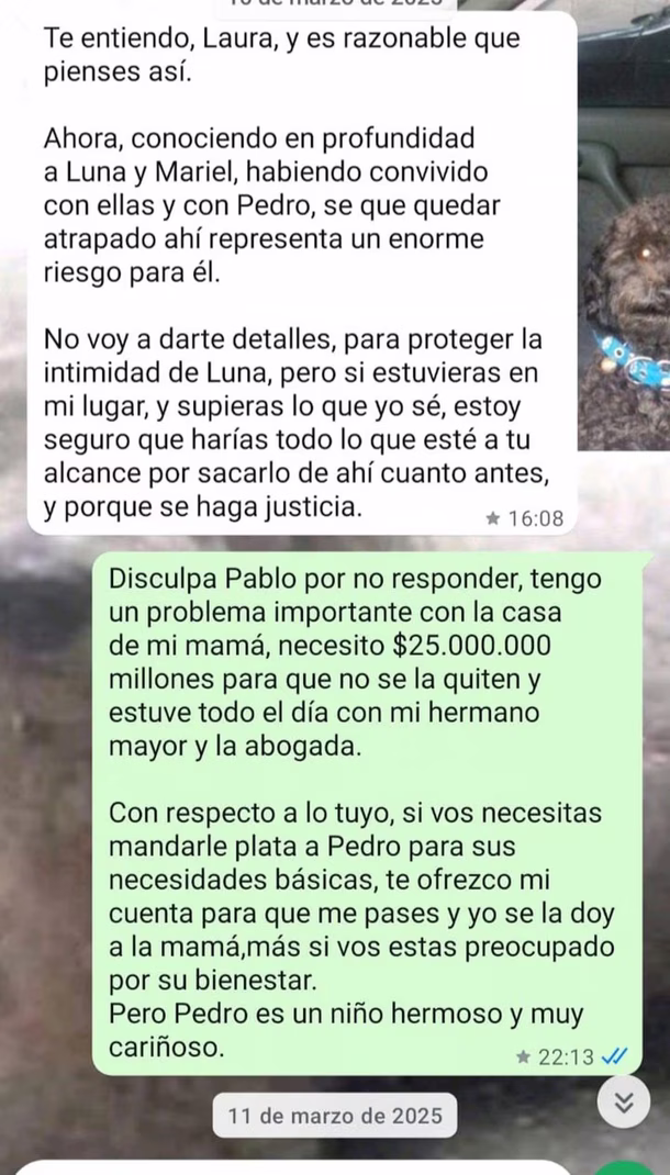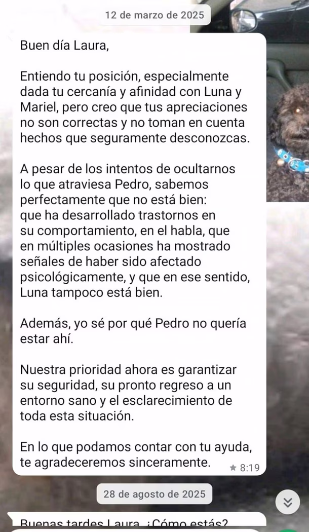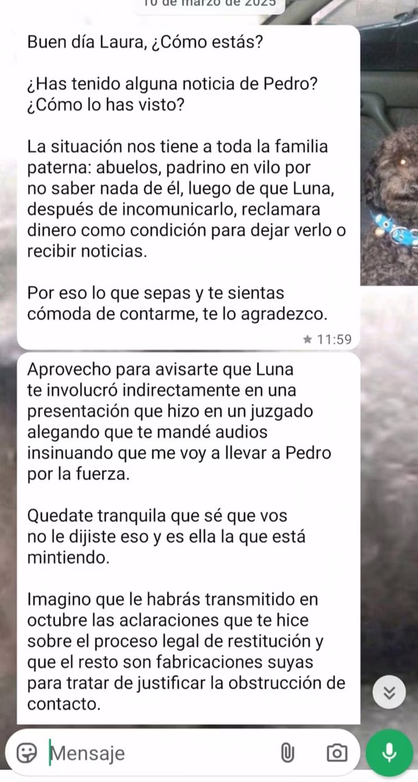 "Buen día, Laura, ¿cómo estás? ¿Has tenido alguna noticia de Pedro? ¿Cómo lo has visto? La situación nos tiene a toda la familia paterna, abuelos y padrino, en vilo por no saber nada de él, luego de que Luna, después de incomunicarlo, reclamara dinero como condición para dejar verlo o recibir noticias. Por eso, lo que sepas y te sientas cómoda de contarme, te lo agradezco", escribió el uruguayo, mientras intentaba explicar su postura.