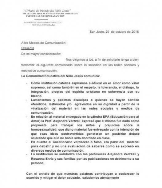 En el comunicado consta que la profesora Alejandra Verzzalli explicó que "dicho material fue entregado con la intención de que esas ideas controvertidas generaran un posterior debate aclarando que aún había sido abordado en clase".