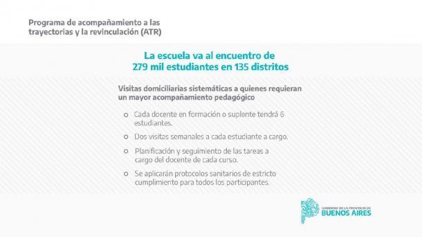 El Ministerio de Educación de la provincia de Buenos Aires adelantó este lunes detalles sobre el plan de acompañamiento a las trayectorias y revinculación de estudiantes (ATR) que busca garantizar la continuidad pedagógica de 279 mil alumnos en el marco del aislamiento.