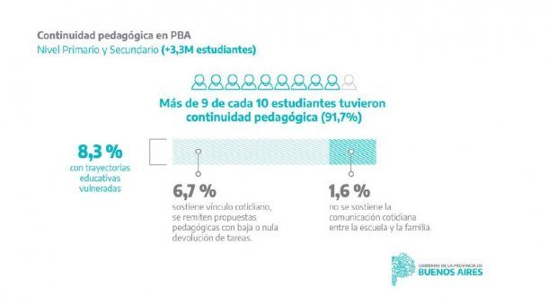 Desde Educación se precisó que 225 mil de estos estudiantes de primaria y secundaria mantienen actualmente algún tipo de vínculo con la escuela, pero requieren una continuidad pedagógica de mayor intensidad ya que no realizaron devoluciones de las tareas, mientras que los otros 54.000 estudiantes actualmente no tienen una vinculación cotidiana con la escuela.