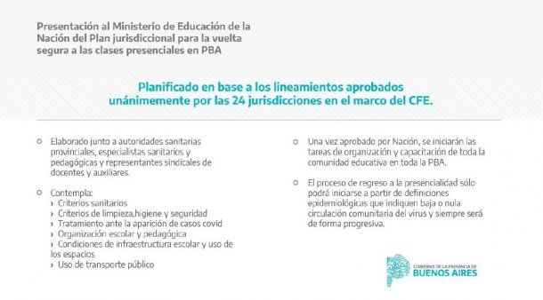 "Una vez que ese plan se apruebe, se distribuirá entre las comunidades educativas de los 135 municipios para conformar unidades de trabajo donde autoridades locales, sanitarias, educativas, gremiales y consejos escolares conocerán los lineamientos obligatorios" para el retorno presencial a las escuelas "y comenzarán el proceso de capacitación y organización".