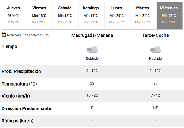 Si bien el miércoles 1° de enero tendrá temperaturas impensadas para la temporada de verano, las lluvias y tormentas llegarán dos días después. En tanto, el primer día del 2025 presentará una mínima estimada de 22 grados y una máxima de 26, con cielo nublado y viento soplando del Este.