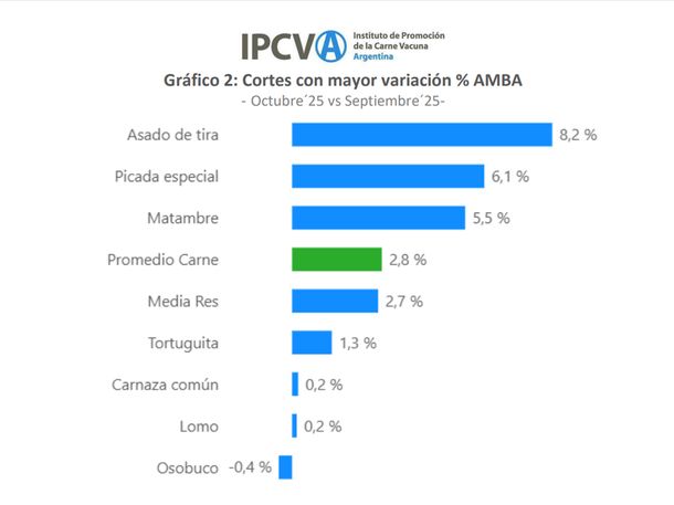 El Instituto de Promoción de la Carne Vacuna (IPCVA) informó este lunes que los precios de los cortes de carne más populares subieron un promedio de 2,8% en octubre de 2025 para los comercios ubicados en el Área Metropolitana de Buenos Aires (AMBA), con un incremento notable del 8,2% en el asado de tira.