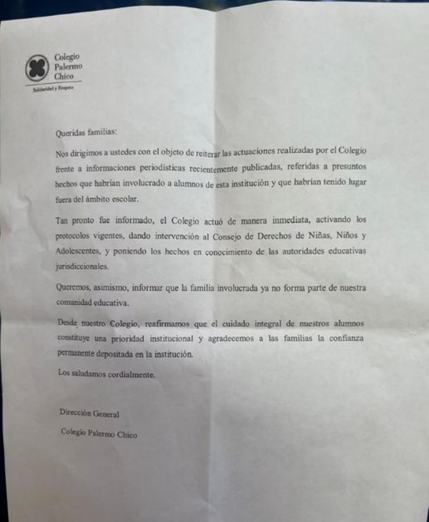 En ese mismo comunicado, el Colegio Palermo Chico buscó llevar tranquilidad a las familias y reafirmar su postura frente a este tipo de situaciones. “Desde nuestro Colegio, reafirmamos que el cuidado integral de nuestros alumnos constituye una prioridad institucional y agradecemos a las familias la confianza permanente depositada en la institución”, concluyeron las autoridades, subrayando que la protección de los estudiantes es un eje central de su accionar.