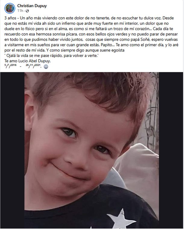 “Espero vuelvas a visitarme en mis sueños para ver cuán grande estás. Papito... Te amo como el primer día y lo haré por el resto de mi vida. Y como siempre digo, aunque suene egoísta, ojalá la vida se me pase rápido para volver a verte. Te amo Lucio Abel Dupuy”, finalizó.
