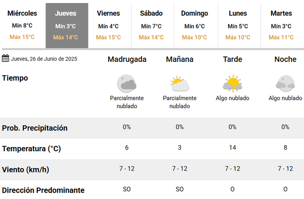 De acuerdo al SMN, este jueves 26 de junio, la temperatura mínima que se espera es de 3 grados, aunque se estima que la sensación térmica podría perforar los 0 grados, según cada sector del Conurbano bonaerense. En tanto, la máxima se ubicará en 14 grados, con cielo parcialmente nublado durante la mañana y algo nublado hacia la tarde/noche.