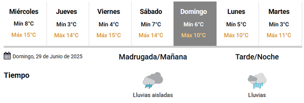 Por otro lado, la llegada de las lluvias está pronosticada para el próximo domingo 29 de junio, cuando el termómetro oscile entre los 6 y 10 grados, estimativamente. Por la madrugada y la mañana se esperan lluvias aisladas, mientras que hacia la tarde y noche del cierre del fin de semana se aguarda por lluvias.