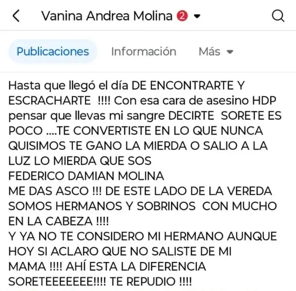 Vanina Andrea Molina, hermana del uniformado, publicó un descargo en Facebook que rápidamente se replicó en distintos medios. En su mensaje no solo mostró indignación por la conducta de su hermano durante la marcha, sino que también lo repudió como familiar. “Hasta que llegó el día de encontrarte y escracharte. Con esa cara de asesino HDP, pensar que llevás mi sangre. Decirte sorete es poco... Te convertiste en lo que nunca quisimos”, escribió la mujer, con evidente dolor y enojo.