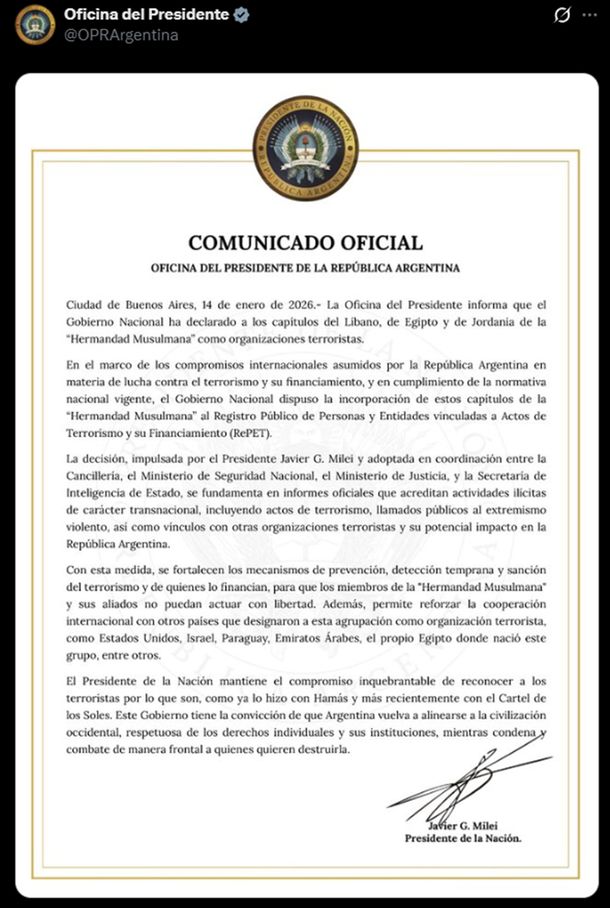 El Gobierno nacional resolvió este miércoles avanzar con la designación de distintas facciones de la “Hermandad Musulmana” como organizaciones terroristas. La medida alcanza a los capítulos con presencia en Líbano, Egipto y Jordania y fue oficializada a través de un comunicado difundido por la Oficina del Presidente.