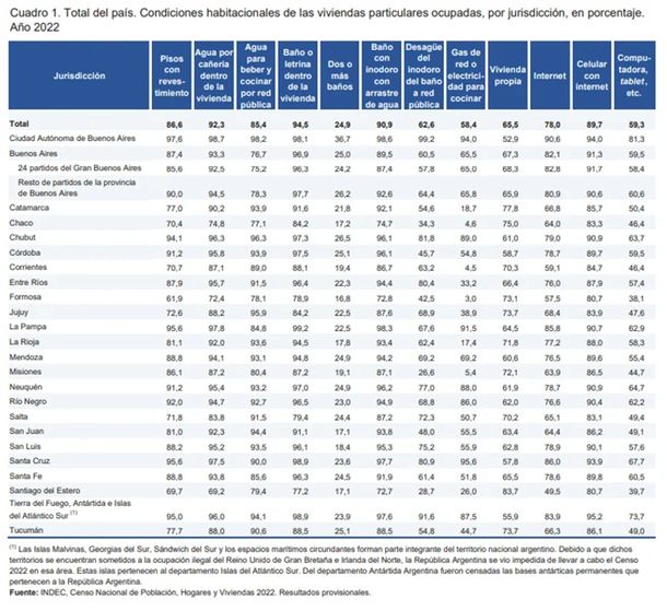 La tabla de "Condiciones habitacionales" del Censo Nacional de Población, Hogares y Viviendas detalla la situación en el territorio bonaerense: